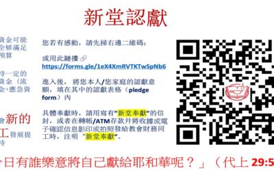 「今日有誰樂意將自己獻給耶和華呢?」‭‭(歷代志上‬ ‭29‬:‭5‬下) 神是丰富的神,祂自己没有需要,却将各样的恩典,厚賜給眾人。大衛王曾想要為祂建聖殿,但神不容許,他說:「我心裡本想建造殿宇,安放耶和華的約櫃,作為我神的腳凳,我已經預備建造的材料, 只是神對我說:『你不可為我的名建造殿宇,因你是戰士,流了人的血。』」(代上28:2-3)可見得蒙神喜悅的大衛王,都沒有福份為神建殿。 在購買龍暉花園一事上,神藉著弟兄姊妹過往的奉獻,已經完成了;而在裝修、遷移的事上,依然有財務上的需要,我們盼望,這是神特別留給我們的機會,讓我們更加參與在神美好的聖工中。...